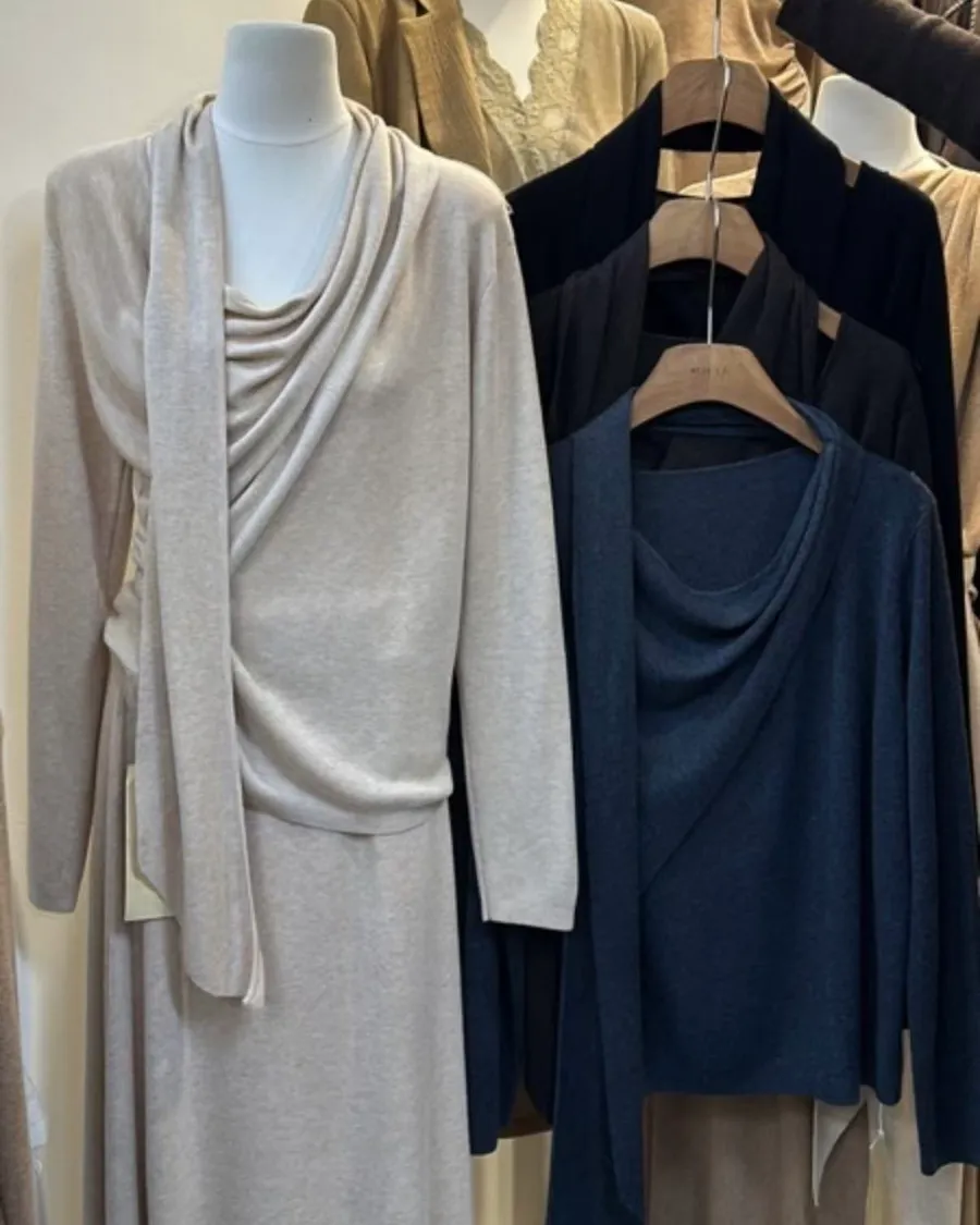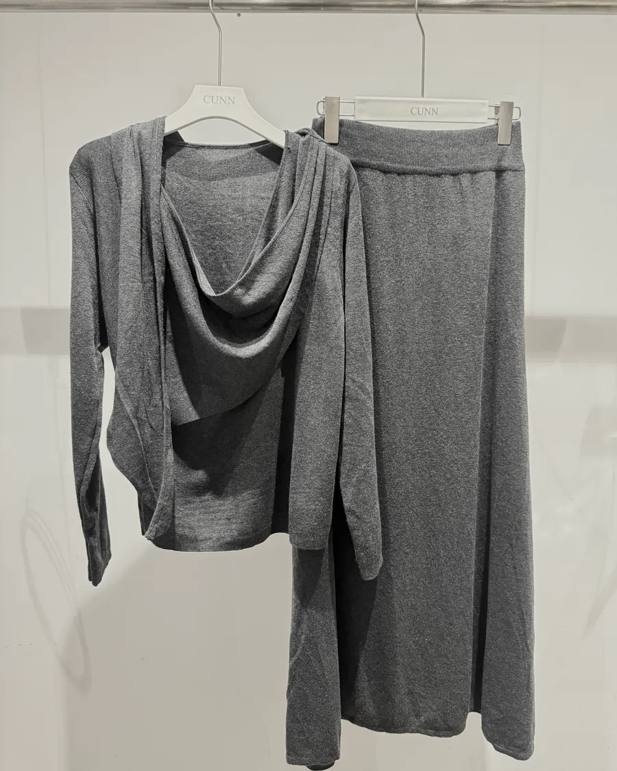 設計感飄帶垂領上衣+超顯瘦鬆緊A字長裙