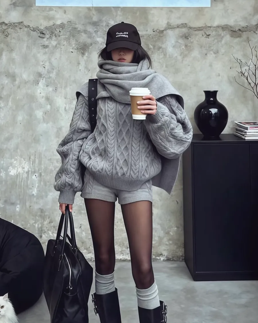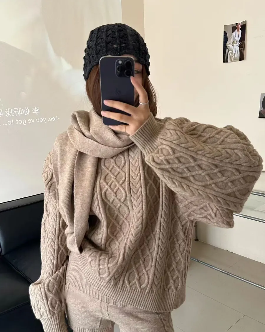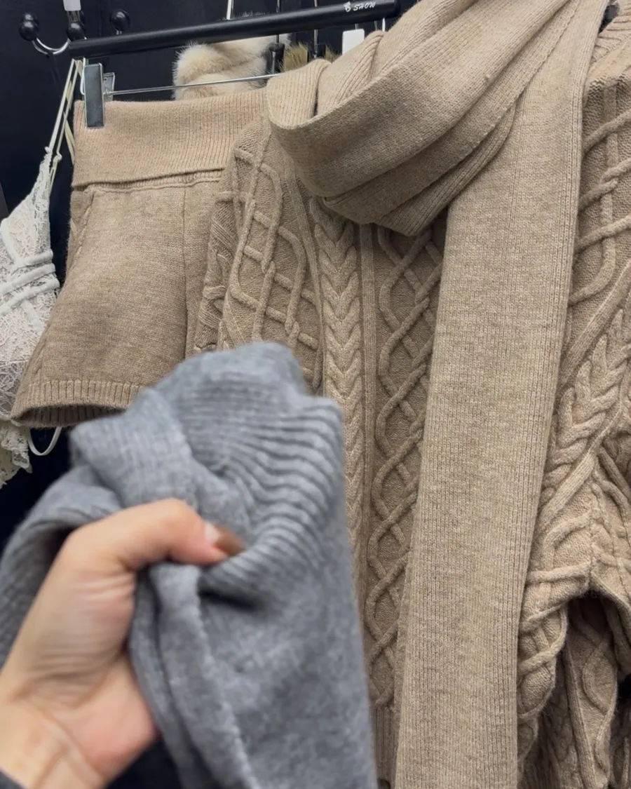 必買!麻花針織毛衣+短褲+圍巾三件套