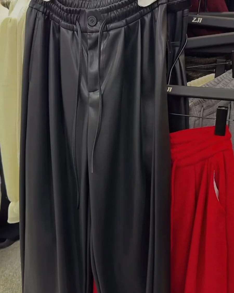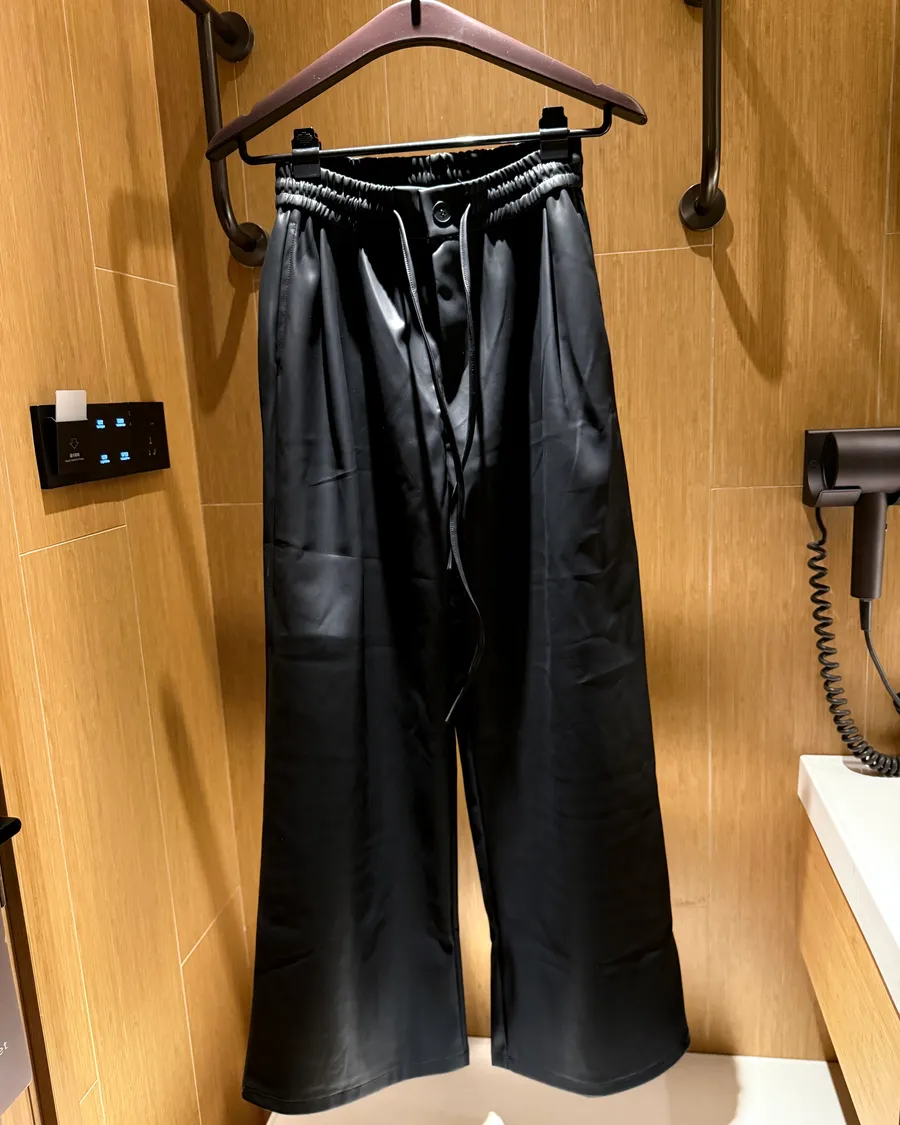 必買!質感歐美鈕扣抽繩闊腿皮褲