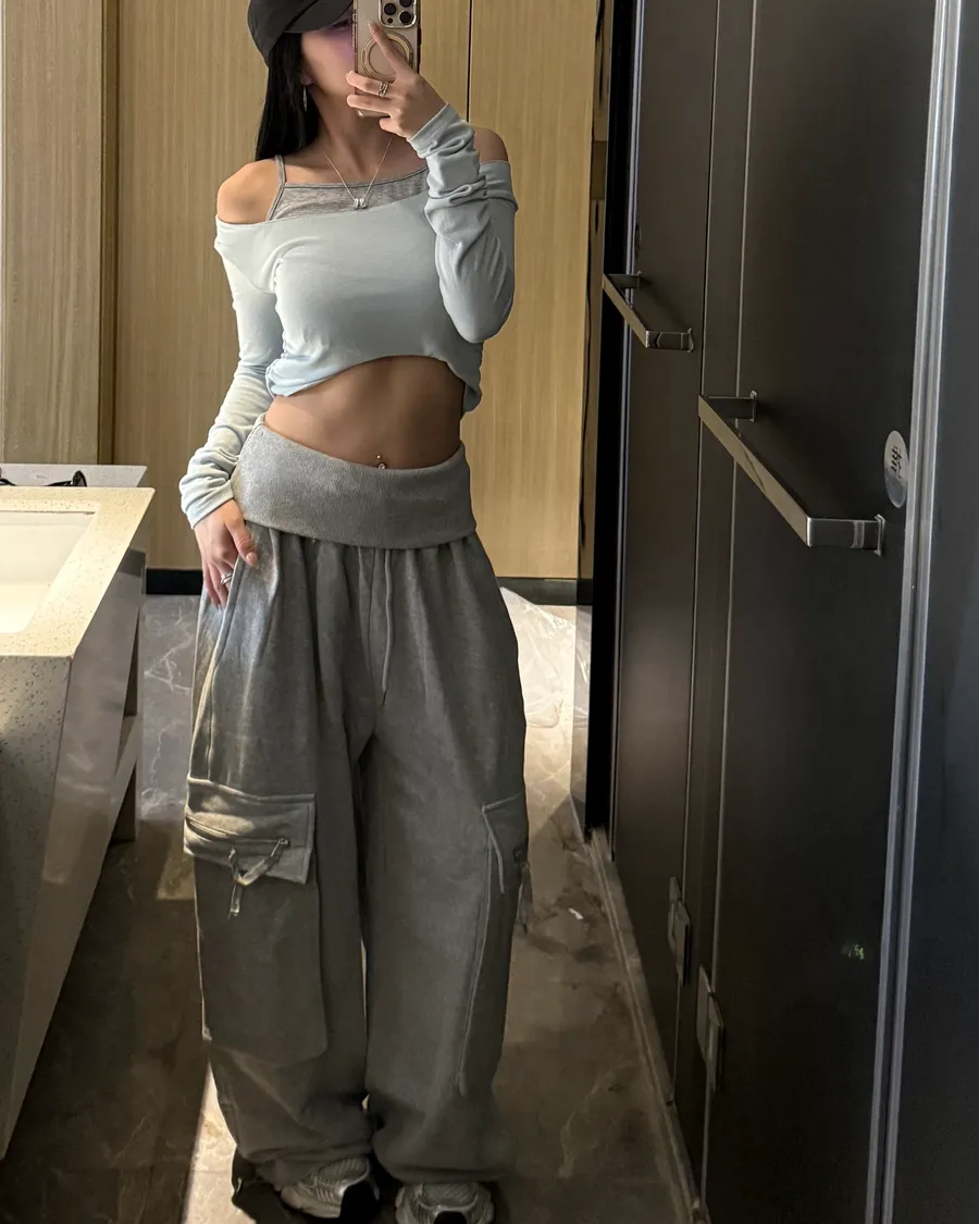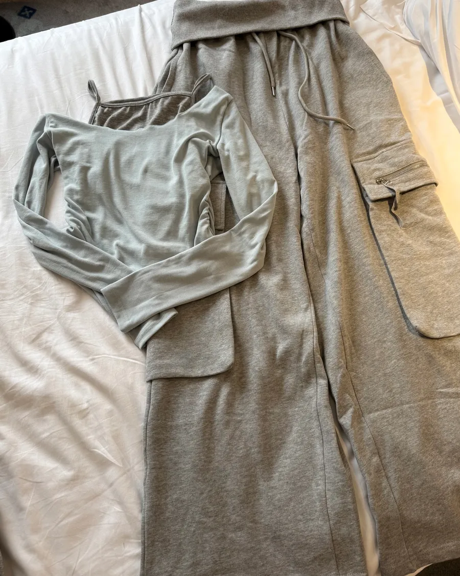 寶寶藍假兩件上衣+灰色工裝褲套裝