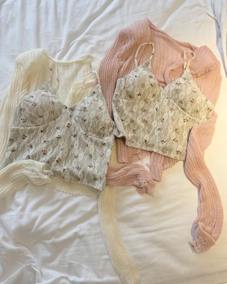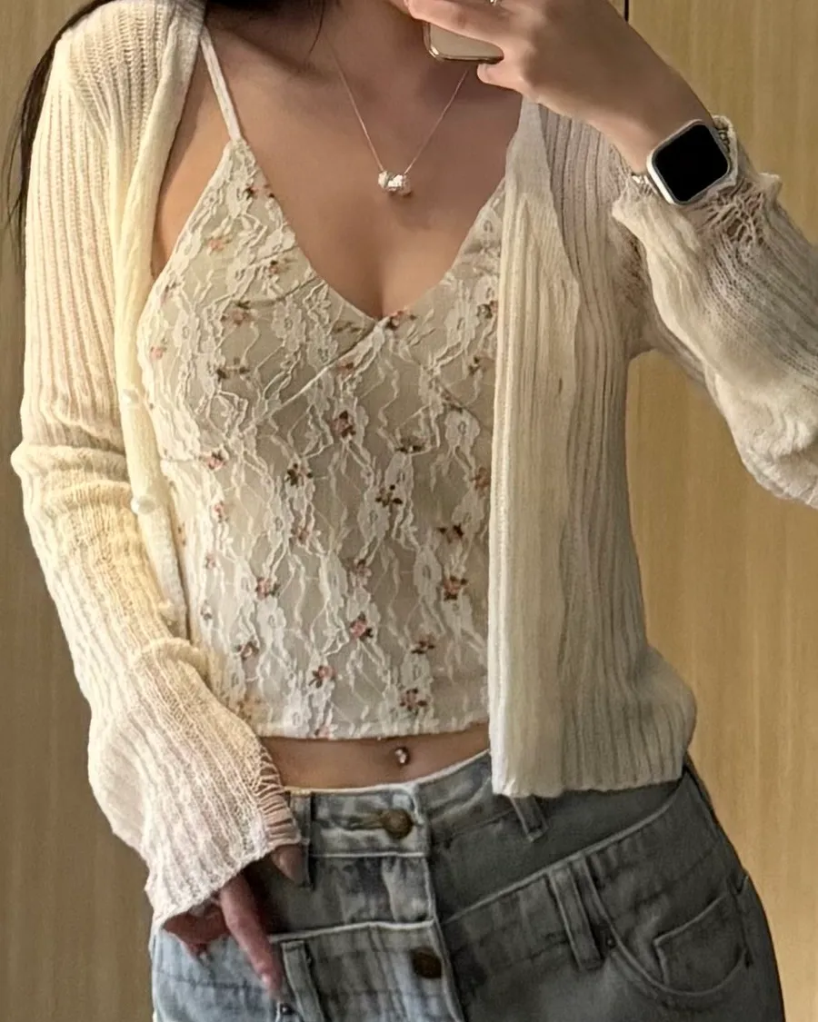 碎花背心+珍珠破壞感罩衫套裝