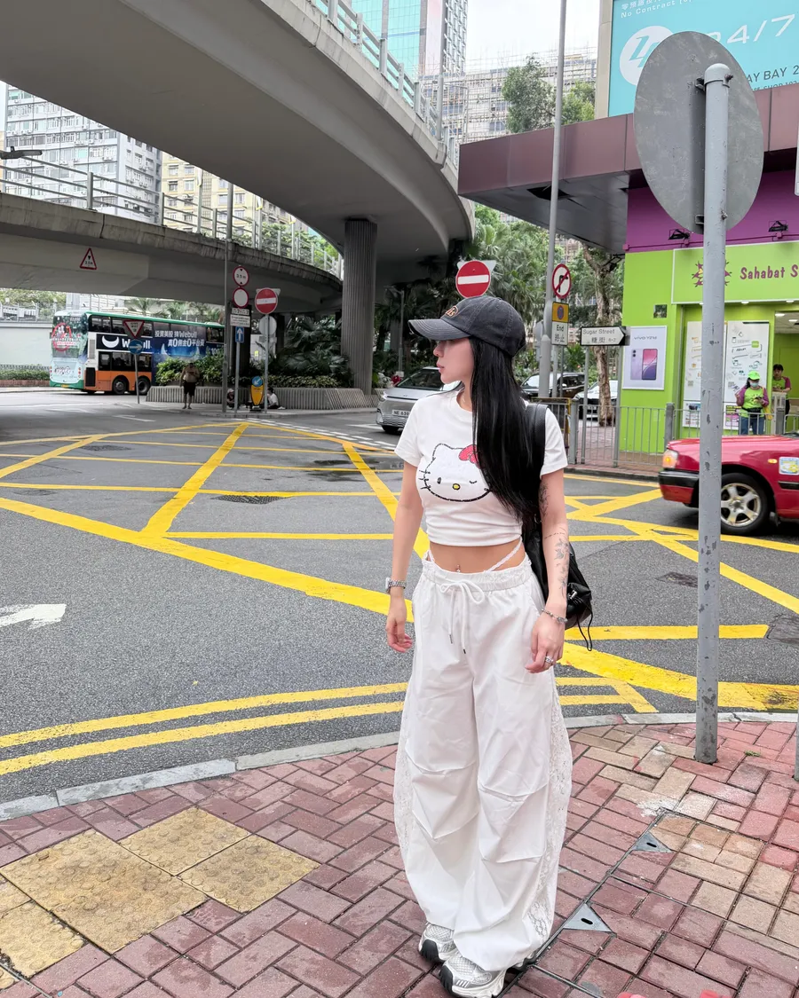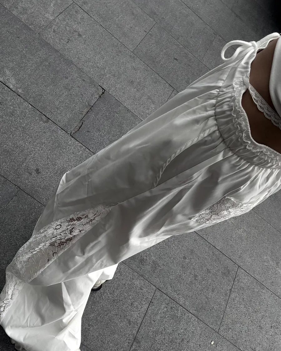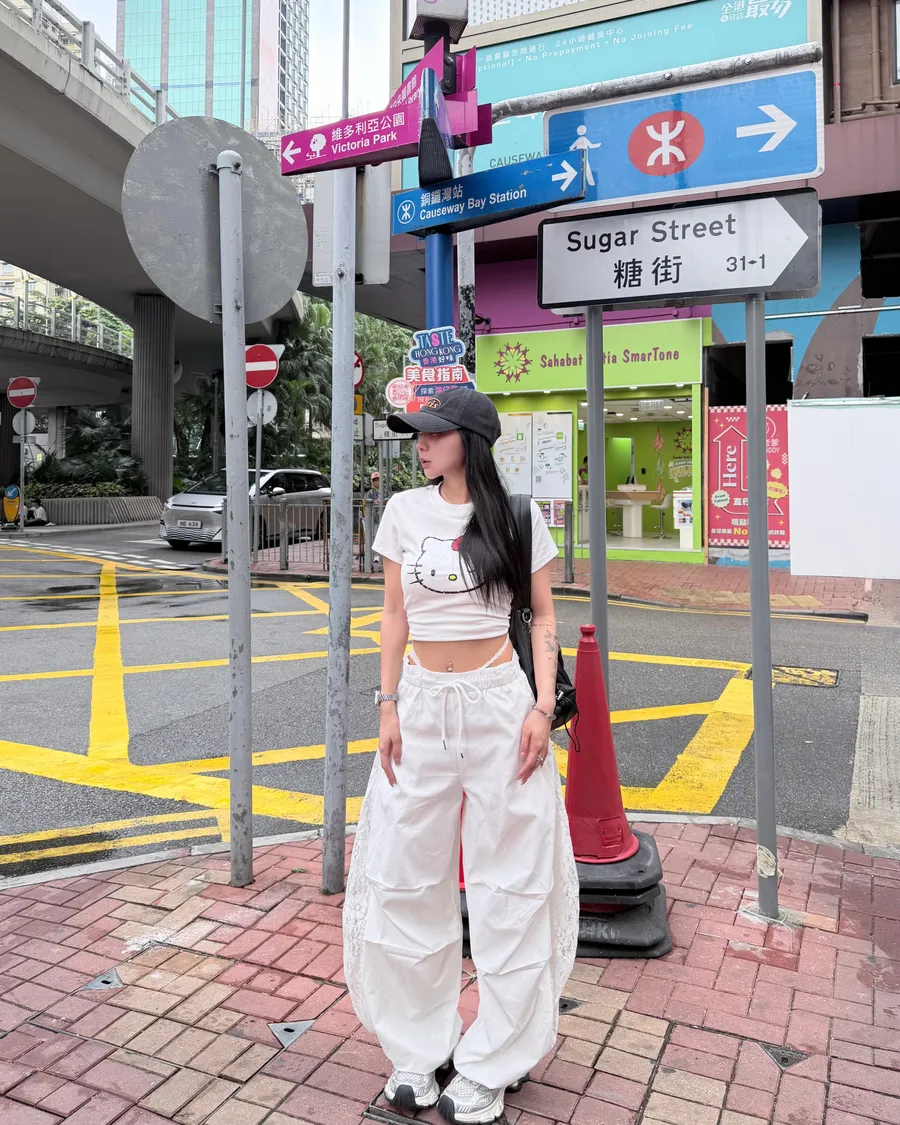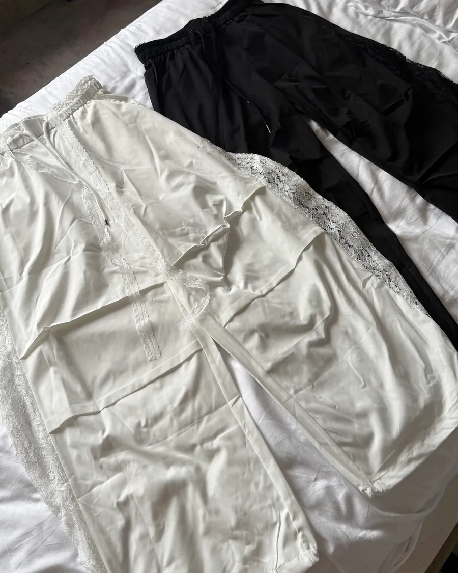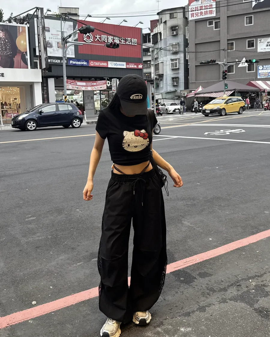 必買!重工側透膚蕾絲唰唰抓皺工裝褲